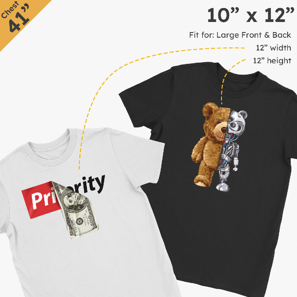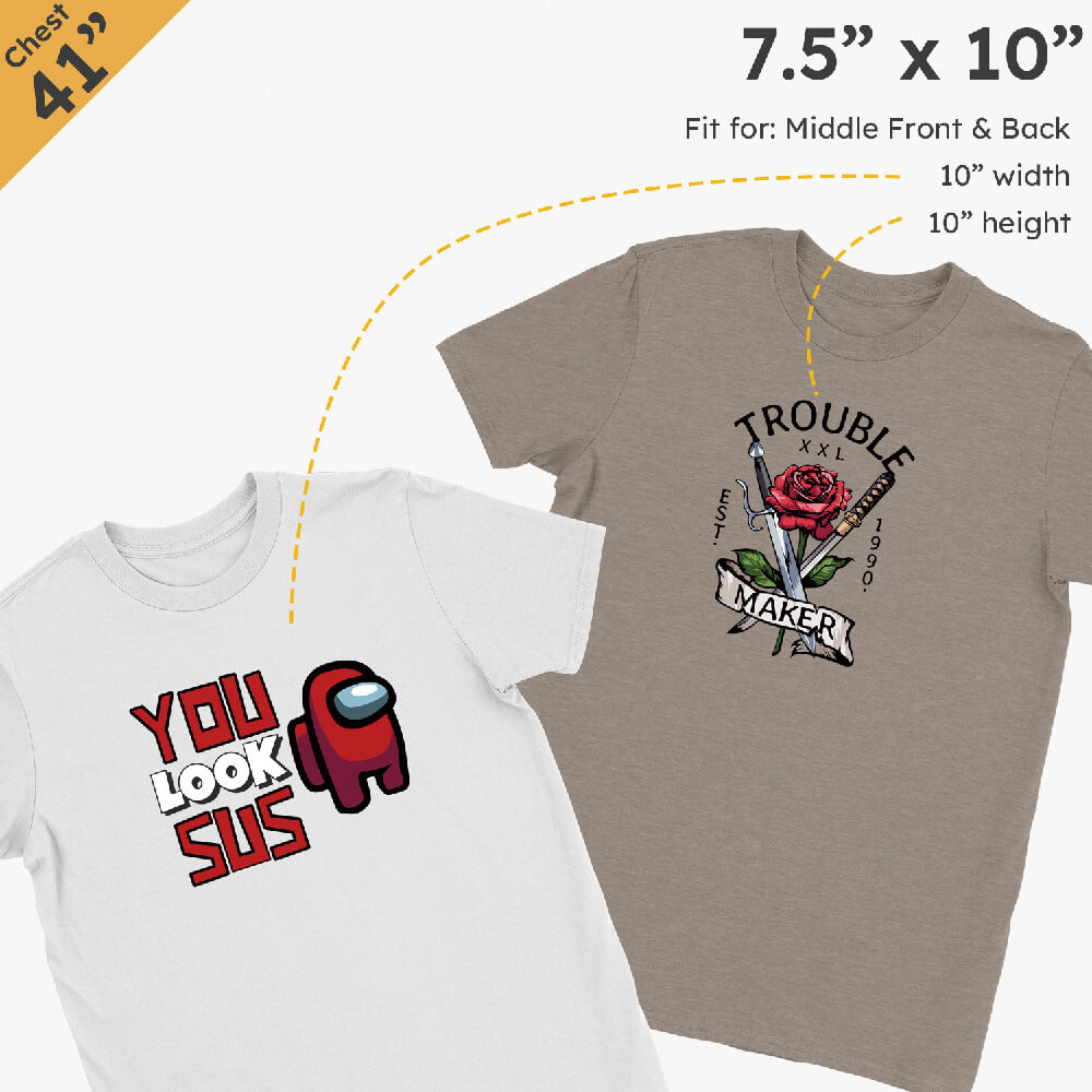 We have made working out what size you need to help you create a gang sheet. These suggested sizes are based on the area you’re decorating. We have a list of the most popular heat transfer sizes which you can use when creating your gang sheets.